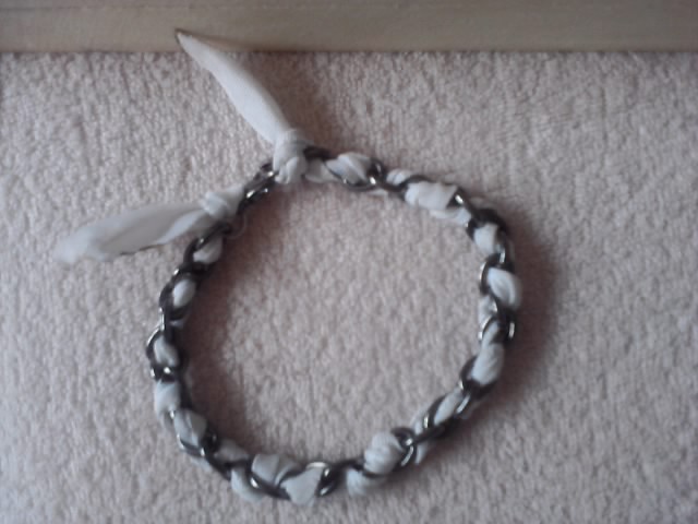 Nejprve uvažte konec stuhy na posledním očku náramku (u zavírání). Pak provlékejte stuhu očky až k druhému konci, tam opět stuhu přivažte. Konce stuhy zkraťte na stejnou délku a opalte zapalovačem, aby se stuha netřepila. HOTOVO!
